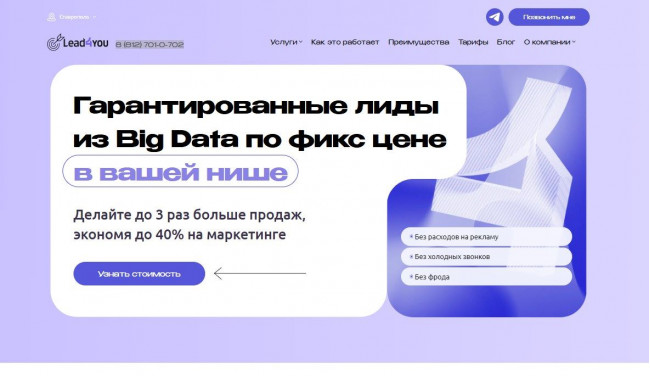 Сервис Lead4You помогает бизнесу получать стабильный поток тёплых заявок без затрат на рекламу, холодные звонки и риск фрода. Мы анализируем спрос в вашей нише, собираем данные через Big Data и передаём только целевые контакты, готовые к покупке.